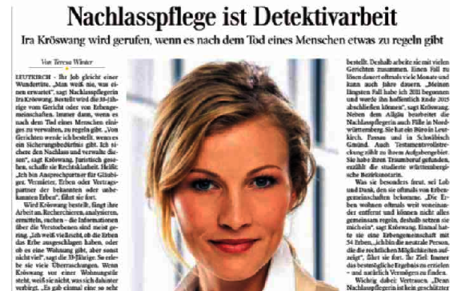 Ira Kröswang arbeitet als Erbenermittlerin und klärt Nachlassfälle, bei denen keine direkten Angehörigen bekannt sind. Ihre Recherchen führen sie regelmäßig ins Ausland. Der Artikel zeigt, wie sie Erben findet und Nachlässe rechtlich sichert.
